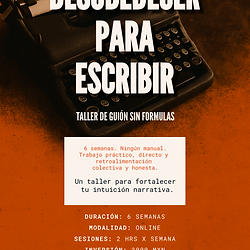 Hay un millón de métodos y gurús allá afuera diciéndote cómo escribir el guión perfecto. Este taller no es uno de ellos. Aquí vamos a desobedecer la idea de que existe una fórmula mágica. Vamos a entender qué es realmente la estructura (y por qué no es lo mismo que un método), a analizar algunos de los métodos más famosos para tomar lo que sí sirve… y desechar lo demás. Durante 6 semanas (6 sesiones de 2 horas cada una) leeremos, escribiremos y nos daremos retroalimentación honesta entre todxs. El objetivo no es seguir reglas, sino desarrollar y afinar tu intuición narrativa: aprender a confiar en tu voz cuando escribes. Puedes traer el proyecto que quieras, en cualquier estado y cualquier punto del proceso: corto, largo, piloto; una idea, un borrador, o algo a medio camino. Lo trabajaremos juntxs y llegaremos lo más lejos posible en esas 6 semanas.
